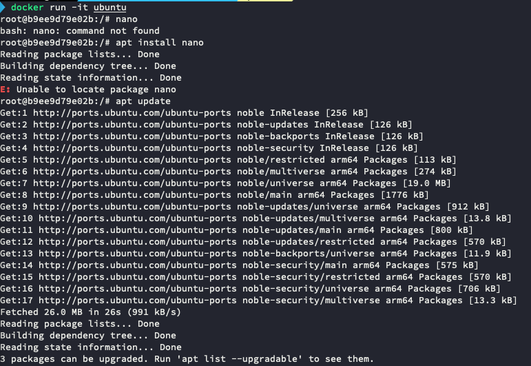 이번에는 shell script사용해서 우분투 도커 컨테이너로 이동됨. root 어카운트로 들어간걸 확인할 수 있고, 패키지 설치가 가능해짐