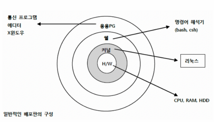 - 리눅스 커널: 리눅스의 핵심부분(자동차로 치면 엔진). Linus B. Torvalds가 1992년에 처음 공개