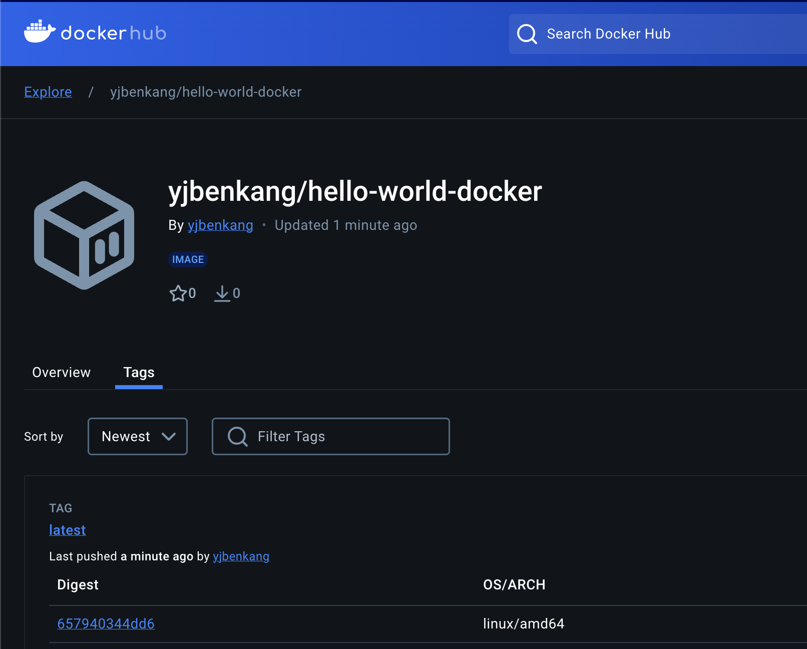 - 예: yjbenkang/hello-world-docker:latest