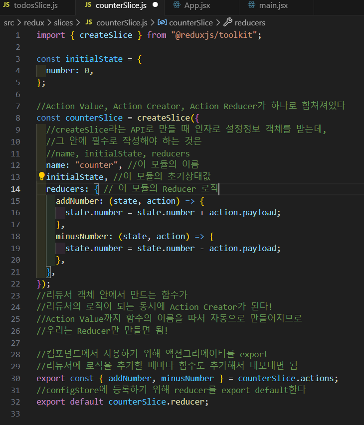 리듀서 파라미터 안에 필드를 정의함으로써, 이 슬라이스 리듀서를 사용하여 모든 상태 변경을 관리하라고 스토어에게 지시