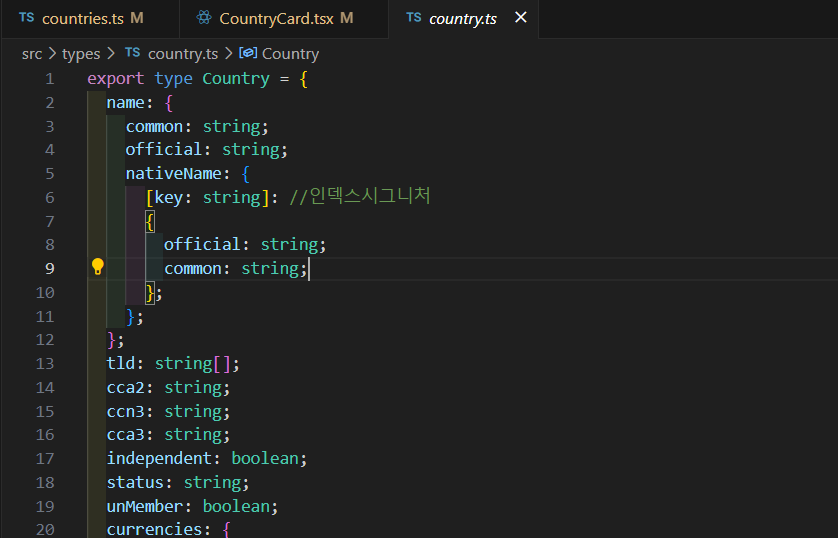 개인 과제에서 API로 나라 정보를 불러왔을 때, nativeName의 key값을 정확히 표기하기 애매했기 때문에 인덱스 시그니처가 사용되었다!
