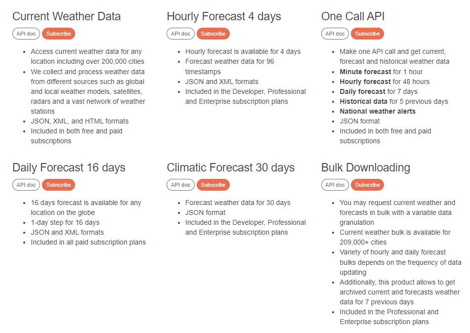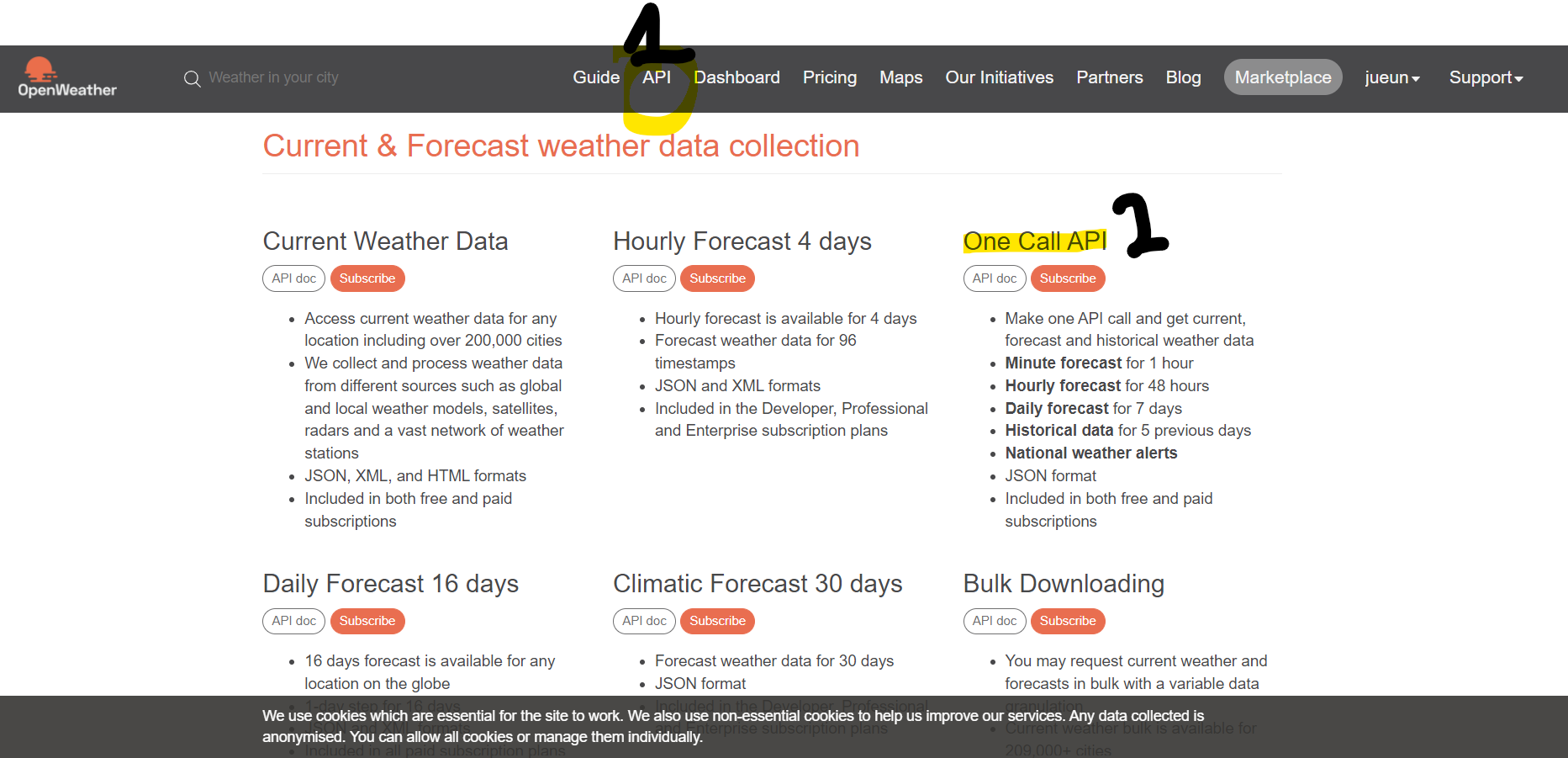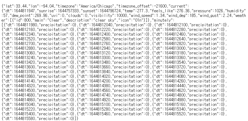• API -> One Call API API doc으로 api 사용법을 확인해볼 수 있음