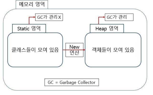 Static 영역은 위 그림처럼 Garbage Collector의 관리 영역 밖에 존재하므로 프로그램의 종료시까지 메모리가 할당된 채로 존재한다. 따라서 Static 영역을 자주 사용하게 되면 시스템의 퍼포먼스에 악영향을 주게 된다는 단점이 있다.