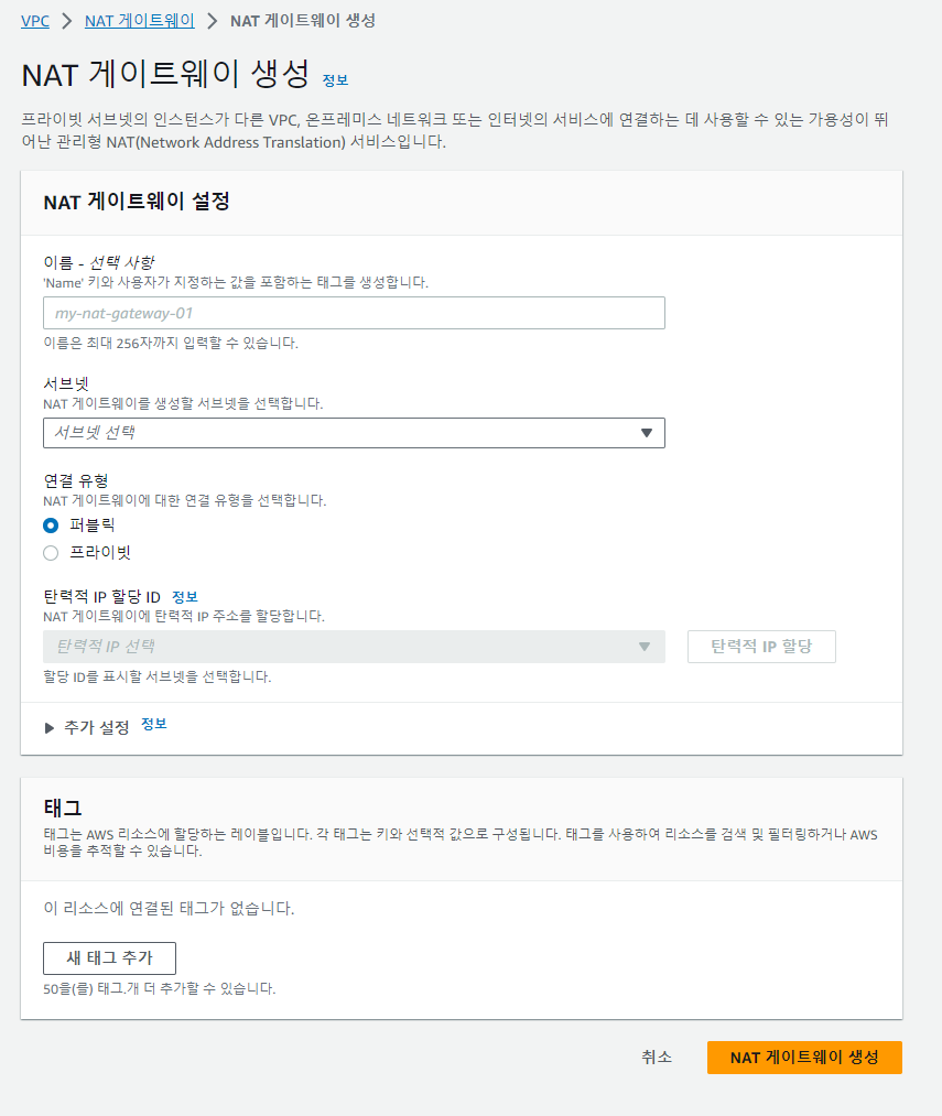 다 설정한 다음엔 nat 게이트웨이 생성버튼을 눌러주세요.