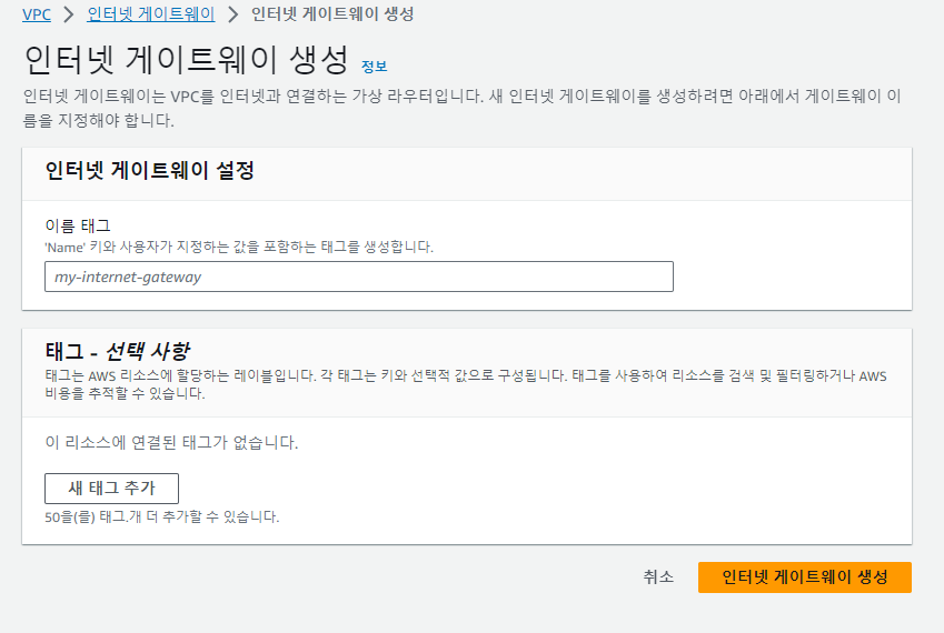 다음은 인터넷 게이트웨이를 vpc와 연결하는 작업입니다.