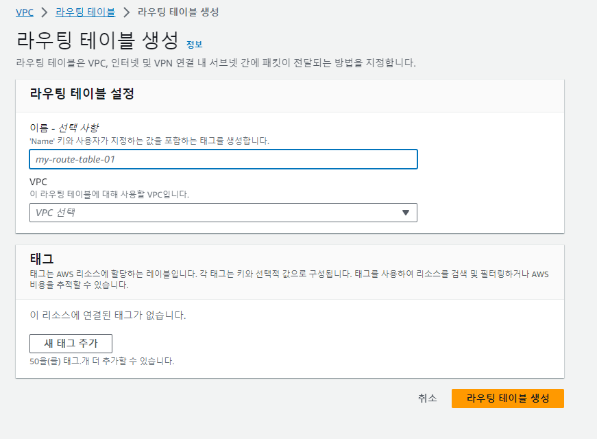 오른쪽 위에 있는 라우팅 테이블 만들기를 눌러 생성화면을 켜주세요.