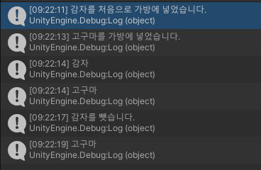 Debug.Log(_value + "를 처음으로 가방에 넣었습니다.");