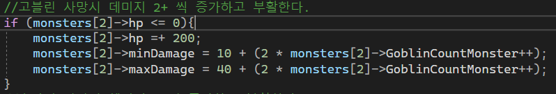 몬스터별로 죽으면 게속 그대로가 아닌 조금씩 강해지게 체력이 오르던 공격력이 오르던 처치 할때마다 값을 올려주었다.