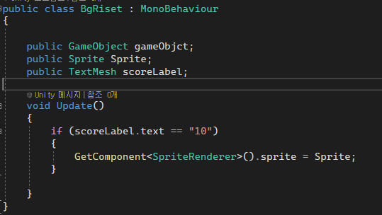 그리고 배경 또한 scoreLabel.text 가 10 이 될시 기본SpriteRenderer 에 다른 sprite를 넣어주었다.