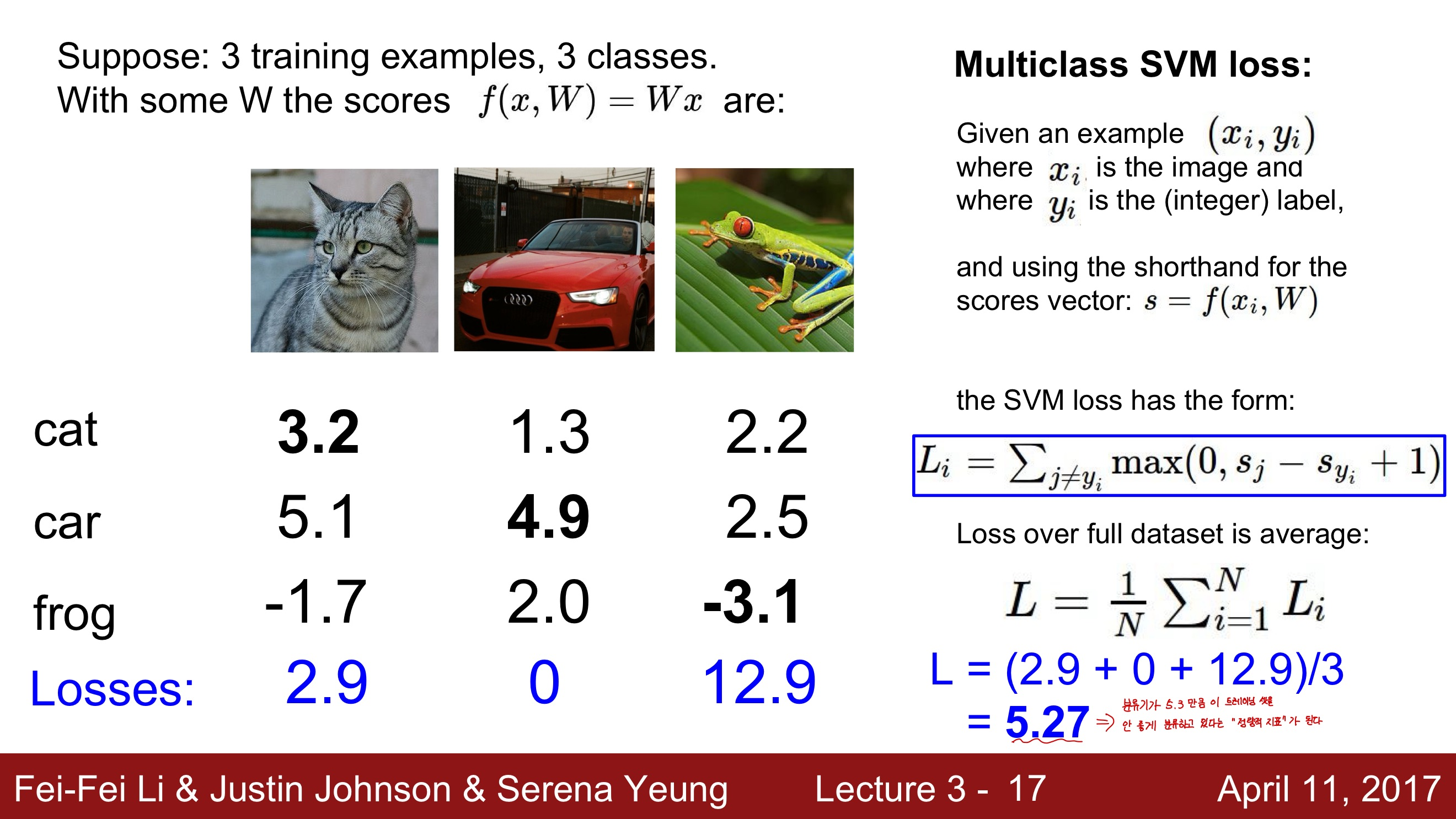 - 손실함수는 W를 입력으로 받아서 각 스코어를 확인하고 이 W가 지금 얼마나 별로인지를 정량적으로 말해주는 역할을 한다
