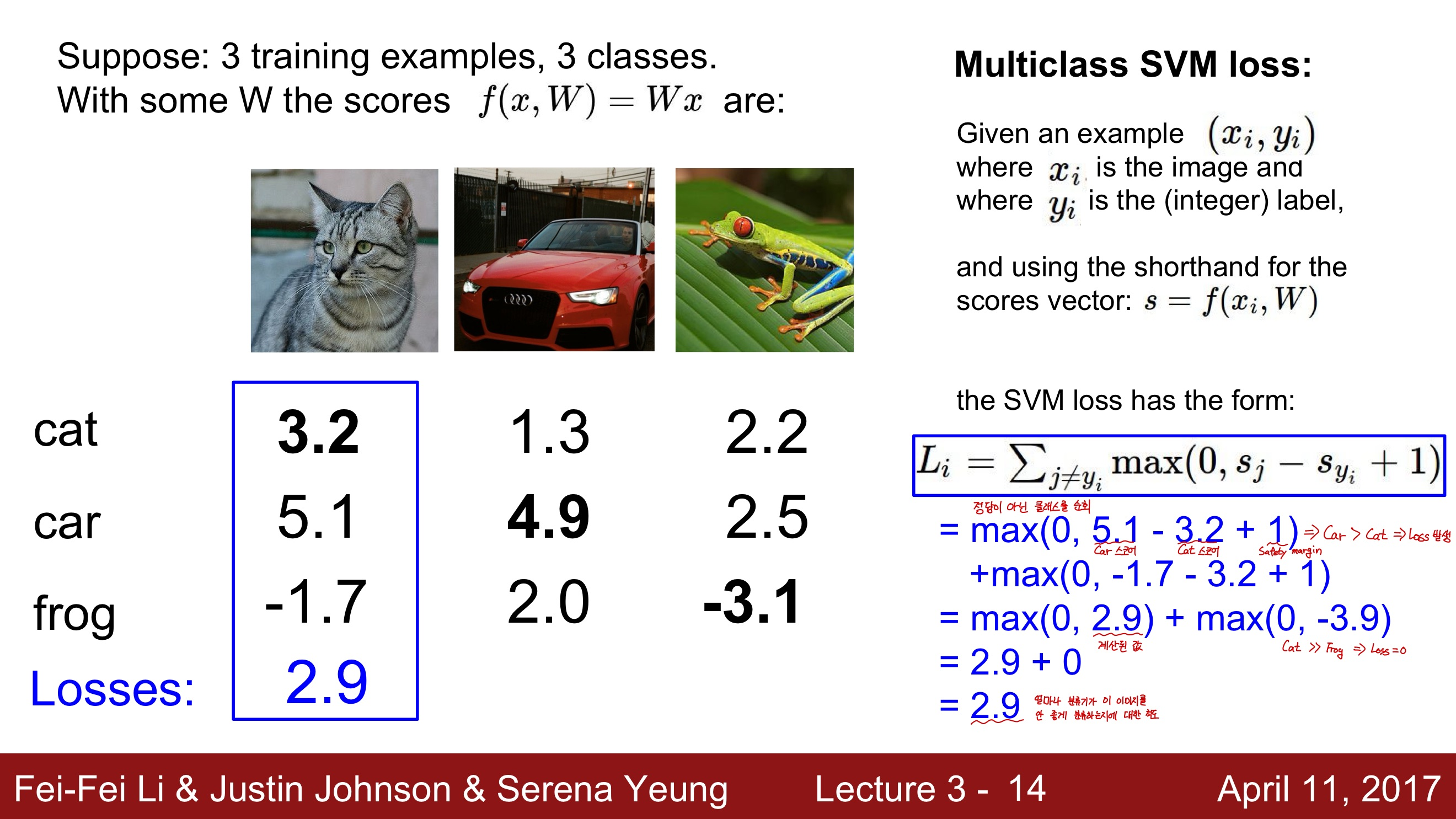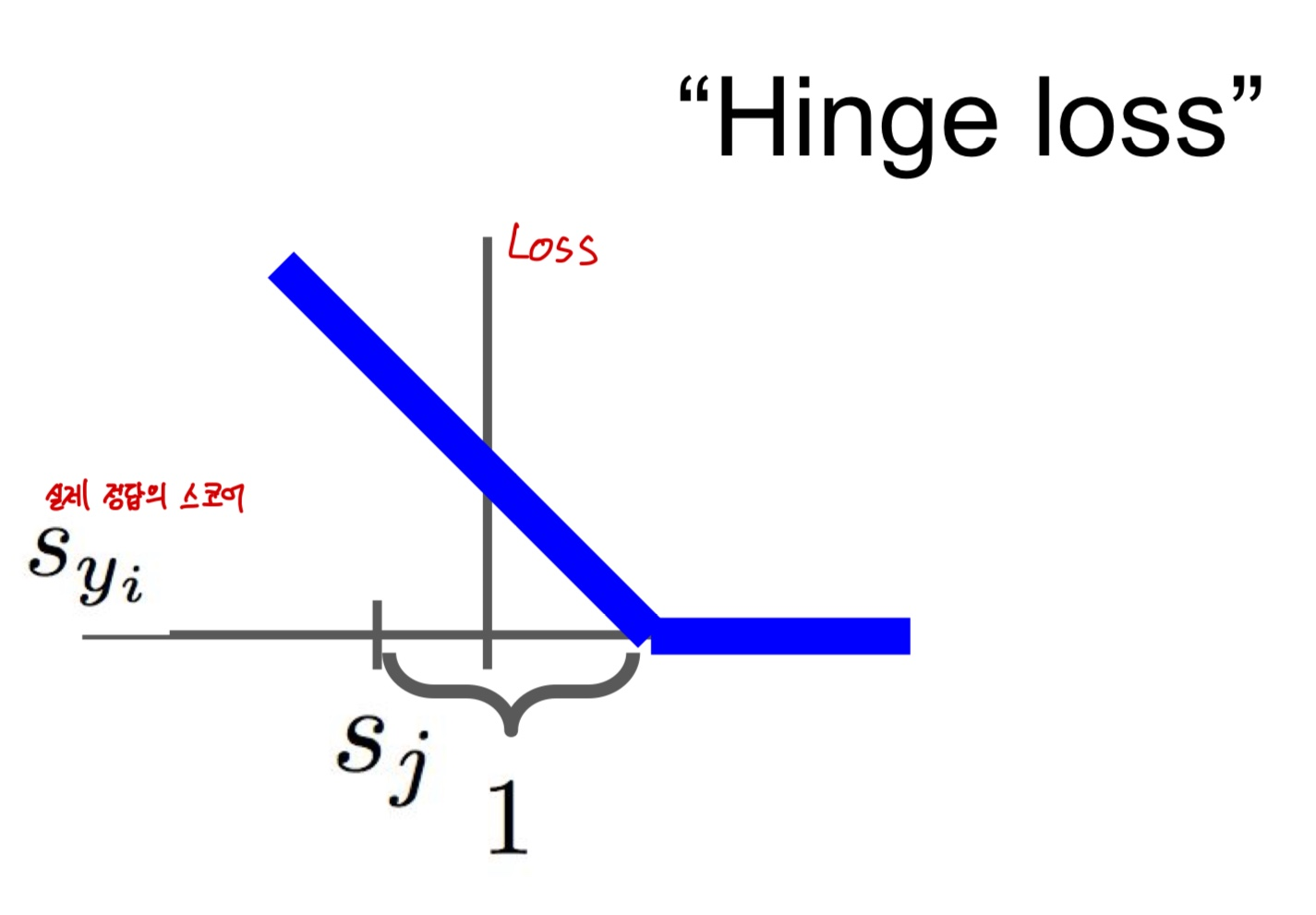 - 만약 올바른 카테고리의 점수가 올바르지 않은 카테고리의 점수보다 더 높으면, 그리고 그 격차가 일정 마진(safety margin) 이상이라면(위 예시에서는 그 마진을 1로 두었다), 이 경우는 True인 스코어가 다른 false 카테고리보다 훨씬 더 크다는 것을 의미하게 된다