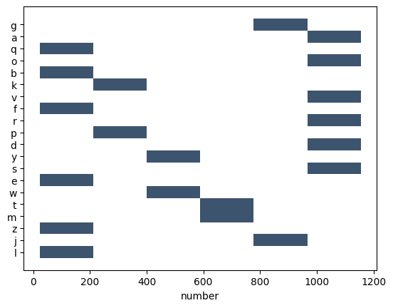 sns.histplot(x=df['number'], y=df.index) #히스토그램 ##히스토그램은 변수의 분포를 시각화하는 데 사용되며, 데이터를 일정한 간격의 구간으로 나누고 각 구간에 속하는 데이터의 수(빈도)를 막대로 표시한다