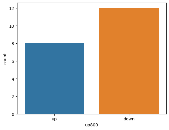 sns.countplot(x = df['up800']) #카운트 플롯은 범주형 열의 각 범주에 대한 빈도수를 막대그래프로 나타낸다