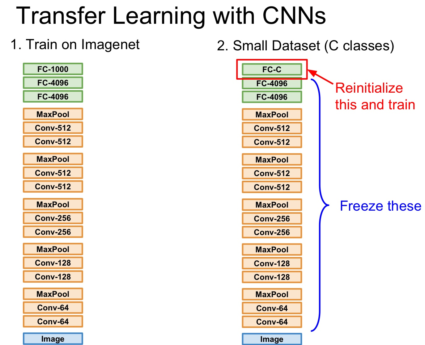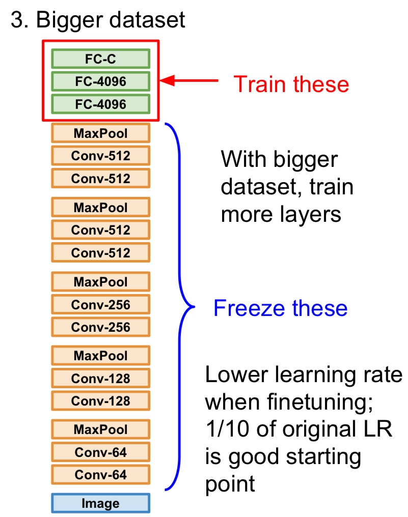 - 기존에 ImageNet을 학습시킬 때는 4,096 x 1,000 차원의 행렬이었지만 새로운 문제를 풀기 위해서 4,096 x 10(C)으로 바꿔주게 된다