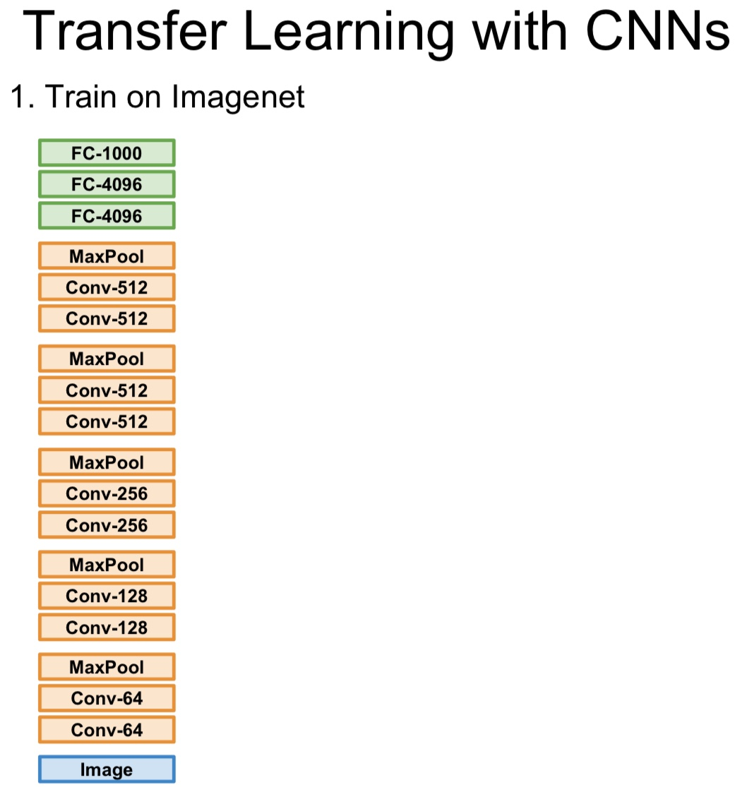 - 이 CNN을 가지고 우선은 ImageNet과 같은 아주 큰 데이터셋으로 학습을 한 번 시킨다