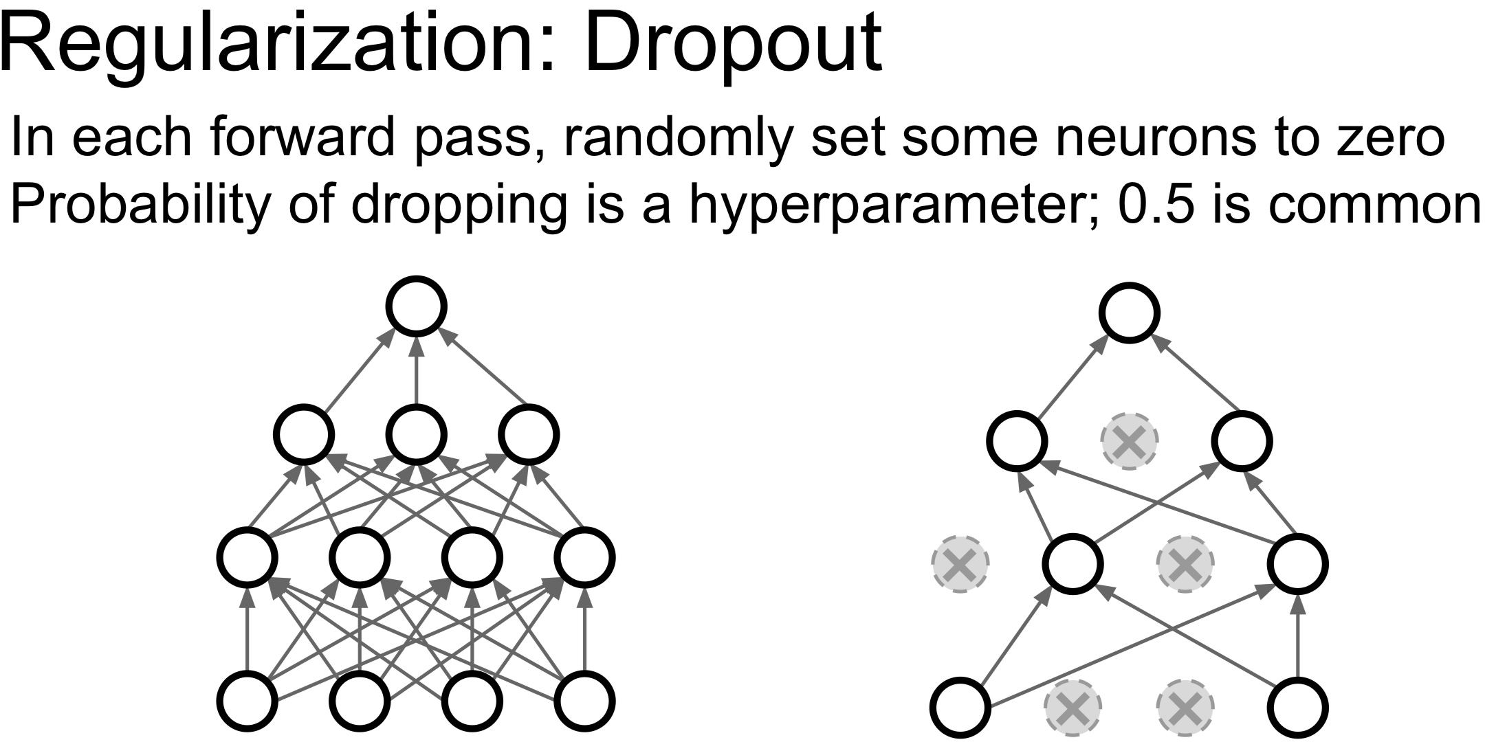 - Dropout은 정말 간단하다. forward pass 과정에서 임의로 일부 뉴런을 0으로 만들면 된다