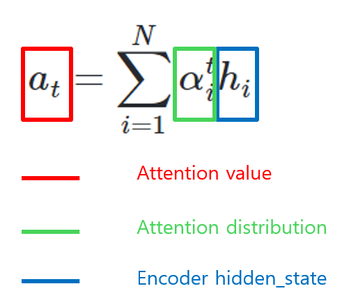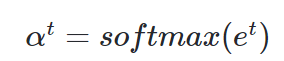 디코더 t 시점에서의 어텐션 분포는 위와 같이 나타낼 수 있다.