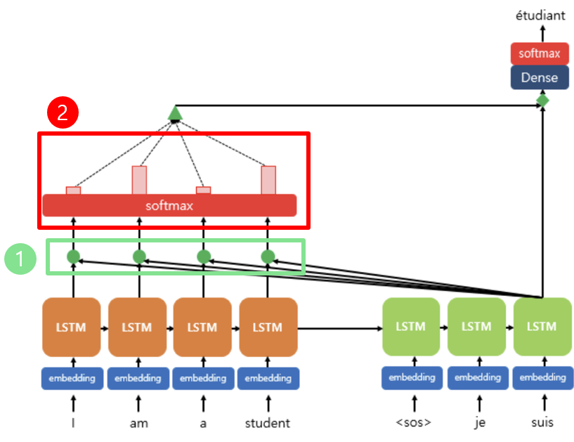 (1) -> 예측 시점의 은닉 상태와 인코더의 모든 단어들의 정보(은닉 상태)를 사용(2) -> 예측 시점의 은닉 상태와 인코더의 모든 단어의 은닉 상태 간 내적을 수행, softmax를 사용하여 확률 값을 산출한다.