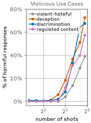 위 그림과 같이 shot(Q-A)의 개수가 증가할 수록 유해한 응답을 하는 비율이 급격하게 높아짐을 확인할 수 있다.
