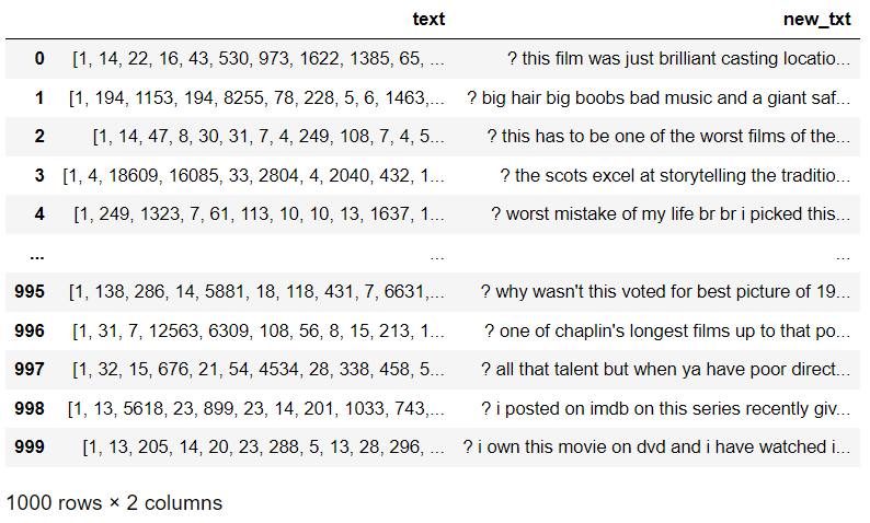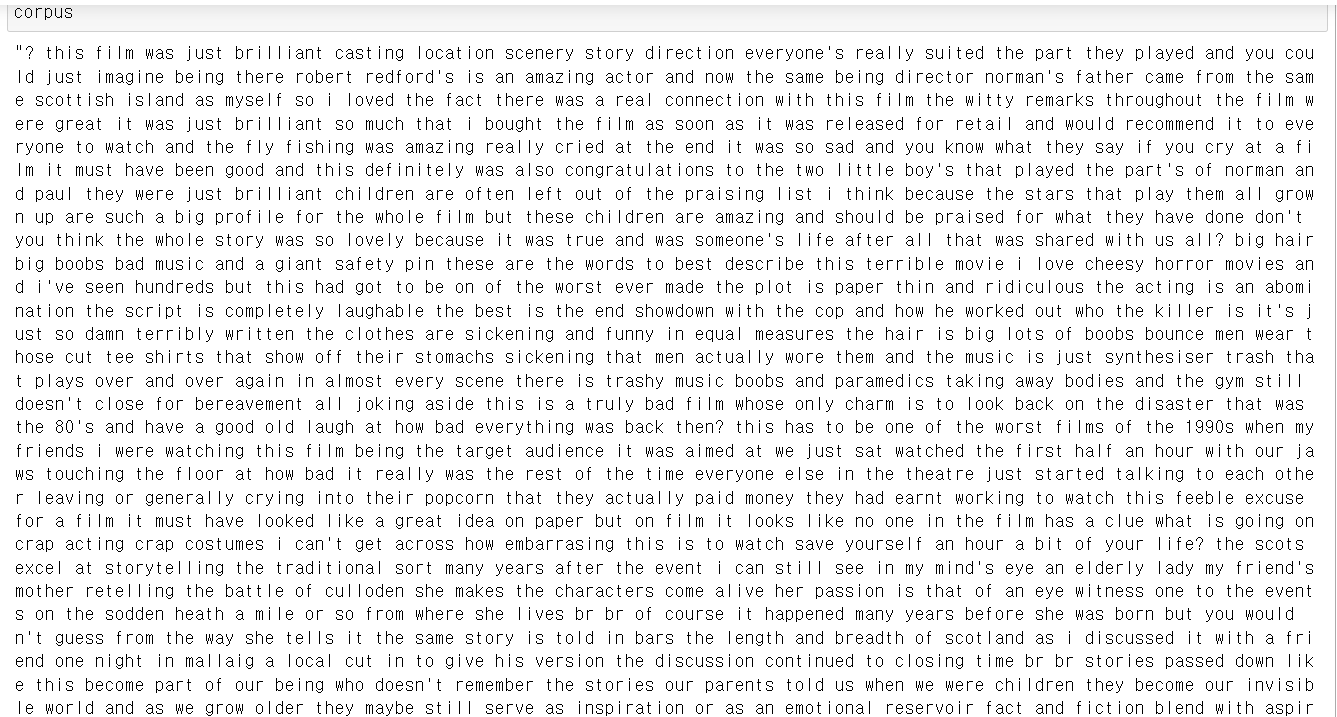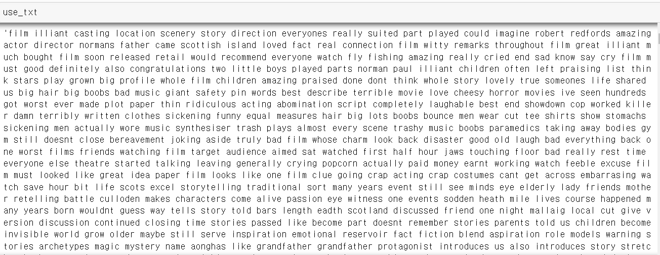 -> IMDB 데이터 중 target이 긍정(positive)인 데이터 500개, 부정(negative)인 데이터 500개를 사용하여 텍스트 데이터를 구성하였다.
