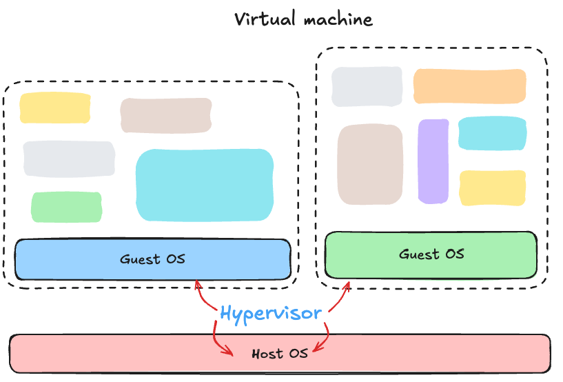 이때 베이스가 되는 기존의 환경은 Host OS, 가상 머신으로 분할된 각각의 환경은 Guest OS 라고 부른다.