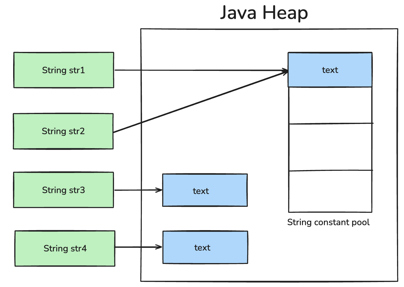 String str2 = "text"; // 기존 "text" 상수 재활용. str 1이랑 같은 메모리 참조