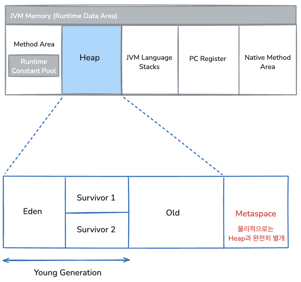 - Metaspace는 JVM 힙 영역이 아닌 네이티브 메모리(운영체제가 관리하는 메모리) 를 사용