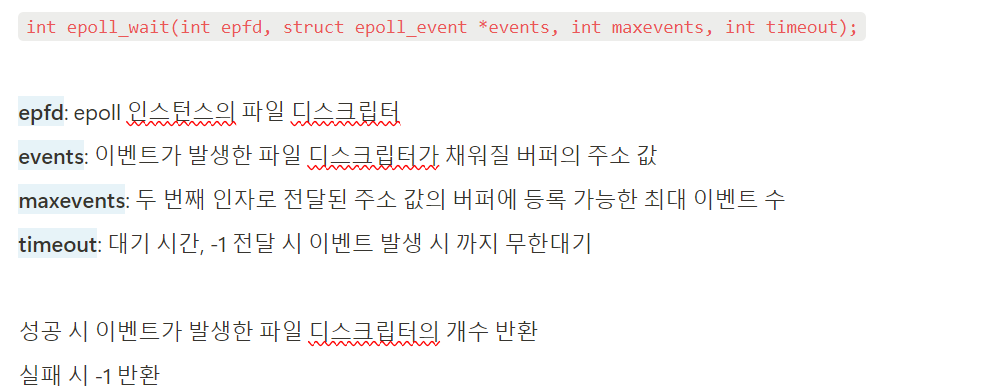 epoll_wait관심 있는 파일 디스크립터에 어떤 이벤트가 발생했는지 조사