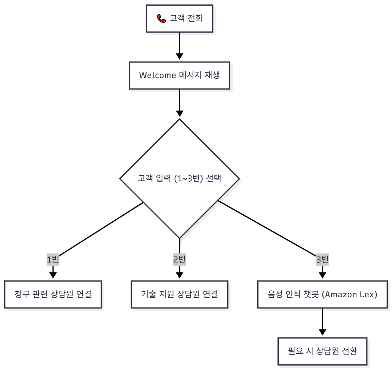 IVR(음성 응답) 또는 AI 챗봇(Lex)으로 초기 응대