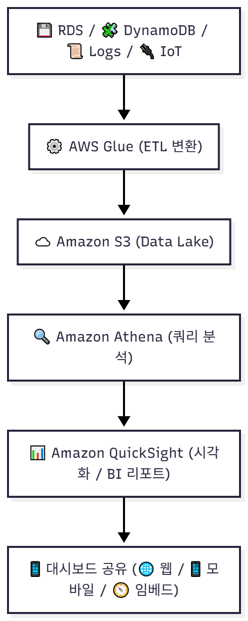 D --> E["📊 Amazon QuickSight (시각화 / BI 리포트)"]