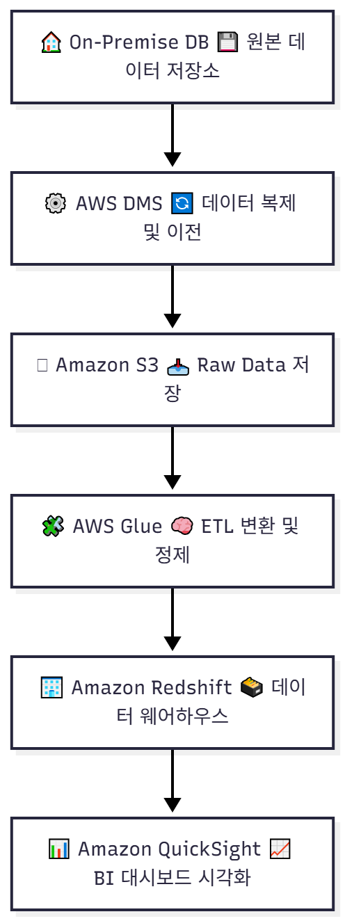 온프레미스 데이터베이스 → DMS로 AWS S3에 저장 → Glue로 정제 → Redshift에서 분석 → QuickSight로 시각화