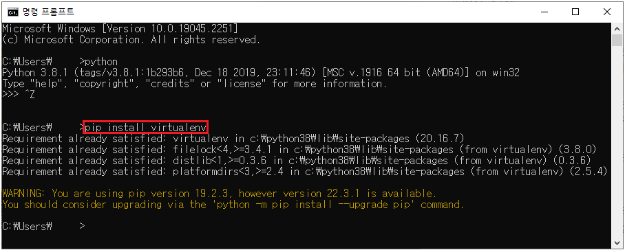저의 경우 Virtual Environment Pakage가 이미 설치되어 있어 다음 캡쳐화면과 같이 나옵니다.