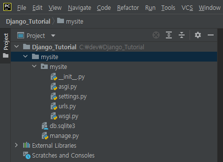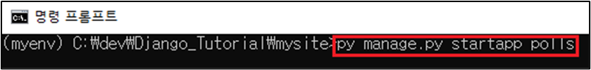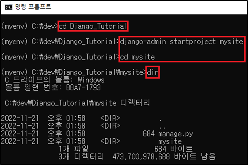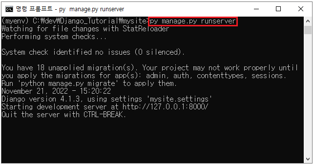 CMD에서 mysite 디렉토리로 이동하여 Django 웹서버 실행