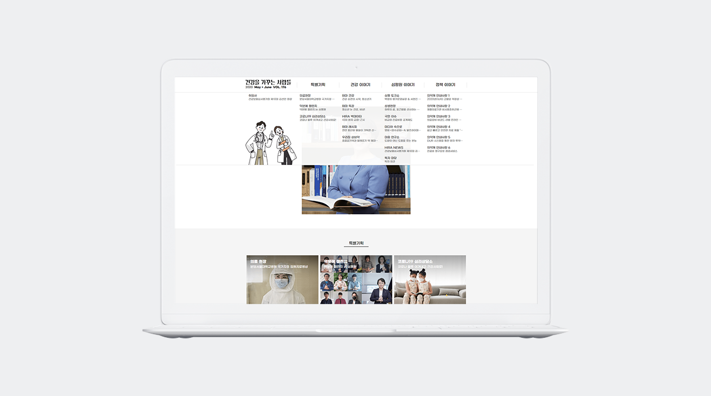 건강보험심사평가원의 소식지 '건강을 가꾸는 사람들'의 웹진을 제작. 종이 잡지 콘텐츠를 웹에 알맞게 다시 디자인하고 퍼블리싱. 기사 구성이 매번 변동되기 때문에 기사 개수가 변화하더라도 유연하게 적용할 수 있는 디자인으로 제작.