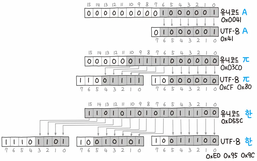 유니코드의 'A'는 아스키코드와 같이 0x41에 해당하는 문자이다. 이론상 1바이트만 있으면 'A'를 표현할 수 있다. 하지만 유니코드를 표 그대로 사용하면 유니코드는 4바이트이기 때문에 1바이트로 표현할 수 있는 'A'를 4바이트로 표현해야 한다. 3바이트 만큼의 낭비가 생기는 것이다. UTF-8은 이런 낭비를 없애기 위해 1바이트로 표현할 수 있는 문자는 1바이트로, 2바이트로 표현할 수 있는 문자는 2바이트로 표현하는 가변 길이 인코딩 방식이다.