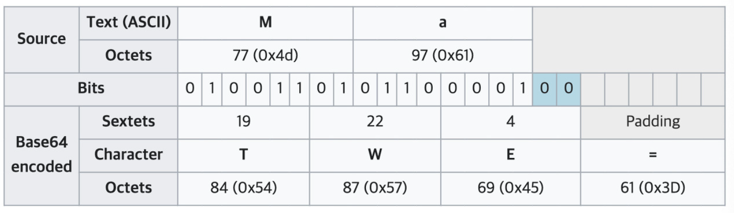 8비트 단위의 문자열을 6비트 단위의 문자열로 나누다보니 8과 6의 최소공배수인 24비트를 채운다. 그렇기 때문에 위의 사진처럼 base64 인코딩 영역이 기존의 8비트 단위의 문자열에 맞지 않는 경우가 있는데 이런 경우에는 0과 padding 문자("=")를 넣어서 24비트를 채워준다.