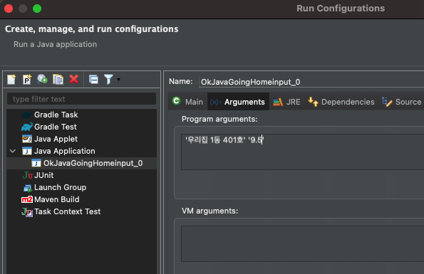 입력값을 미리 설정하고자 하면 우측페이지 탭 중 Arguments를 클릭하여 Program arguments에 원하는 값을 입력한다.
