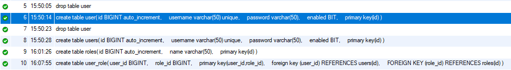 create table users( id BIGINT auto_increment, username varchar(50) unique, password varchar(60), enabled BIT, primary key(id) ); create table roles( id BIGINT auto_increment, name varchar(50), primary key(id) ); create table user_role( user_id BIGINT, role_id BIGINT, primary key(user_id,role_id), foreign key (user_id) REFERENCES users(id), FOREIGN KEY (role_id) REFERENCES roles(id) );