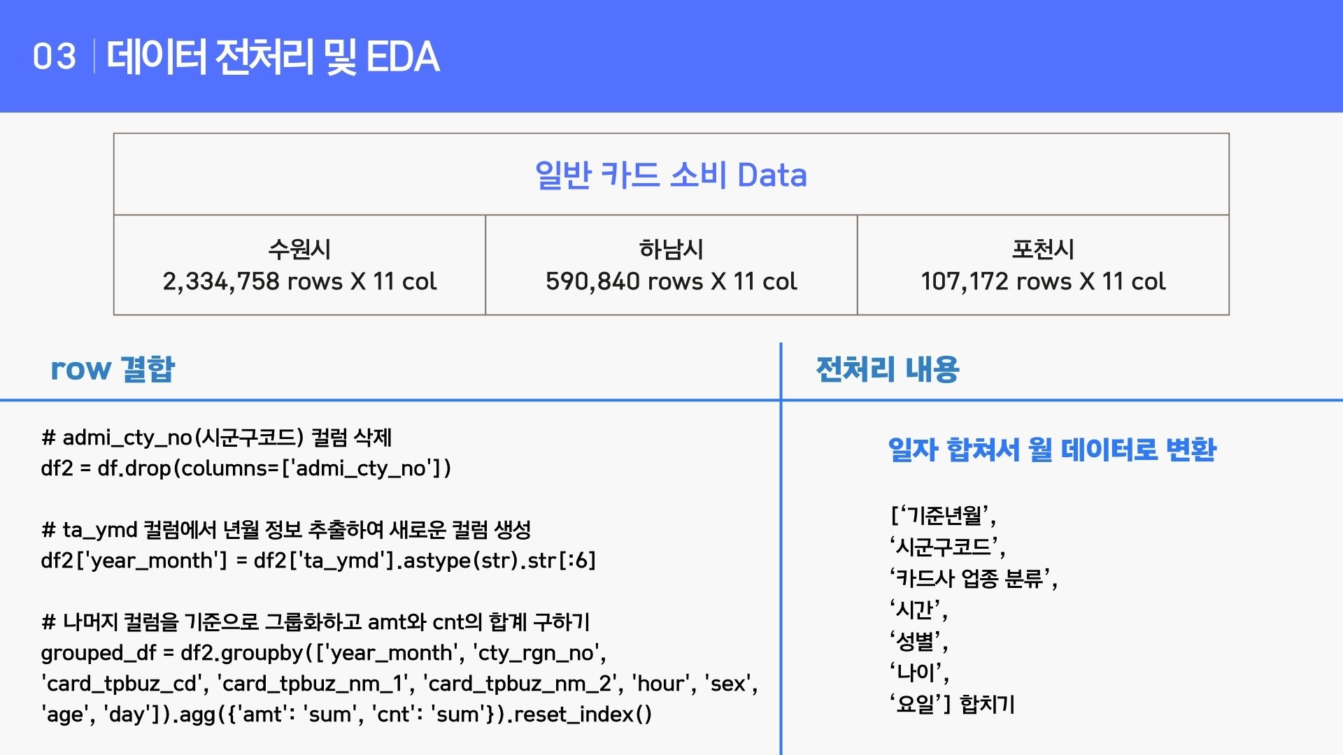 - 다양한 데이터 소스를 효과적으로 통합하고 연계하며 프레젠테이션 상 데이터 전처리에 대한 내용이 데이터셋 별 각각 한 페이지씩 구성되며 row 결합에 대한 내용 및 전처리에 대한 내용이 간결하게 요약 정리되어 좋았다.