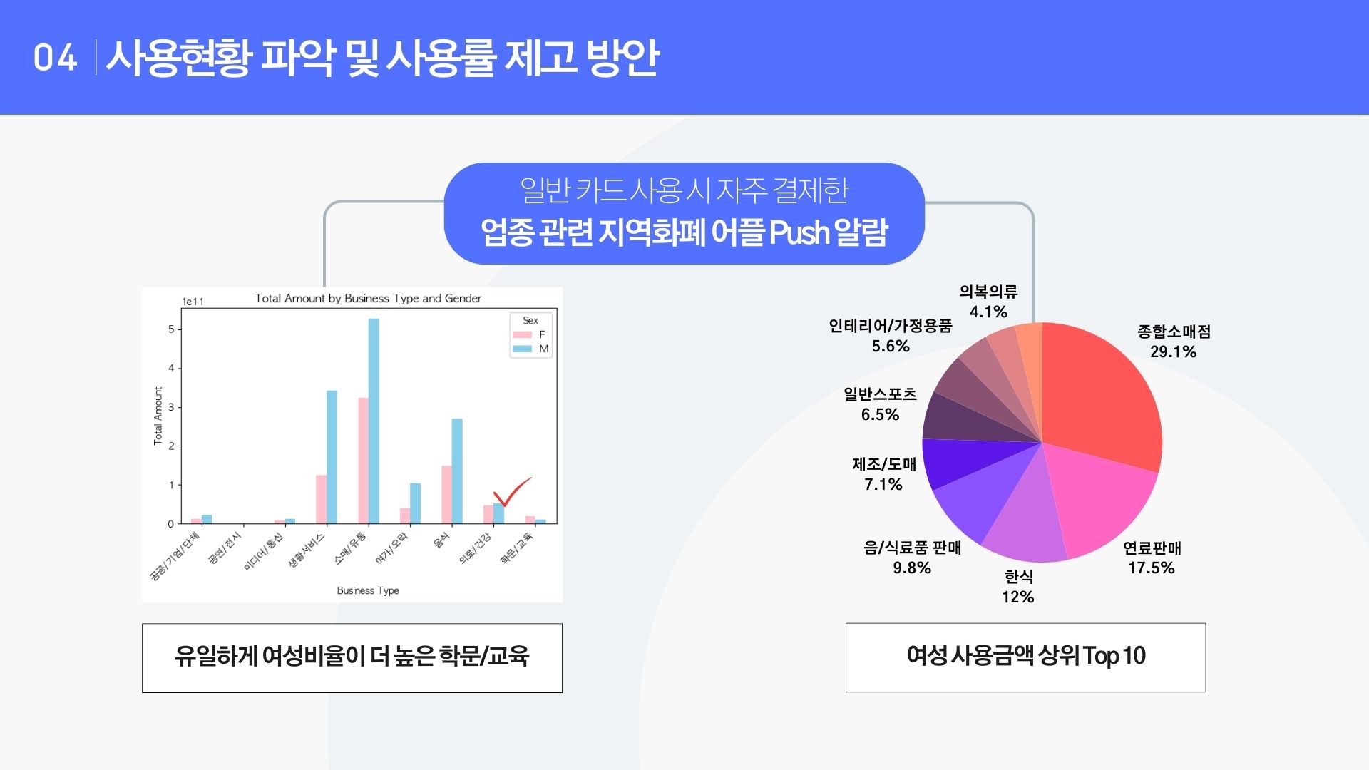 - 특히 성별과 가맹점과의 연관성을 분석하여 구체적인 인사이트를 도출한 점은 좋았다.