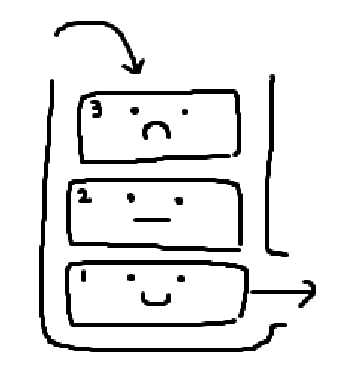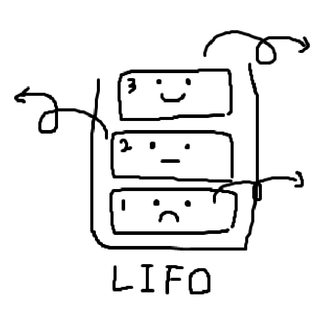 1이 첫번째, 2가 두번째, 3이 세번째로 들어갔을 때 값을 꺼내면, 3이 먼저 나간 후 2, 마지막으로 1이 나오는 구조입니다.
