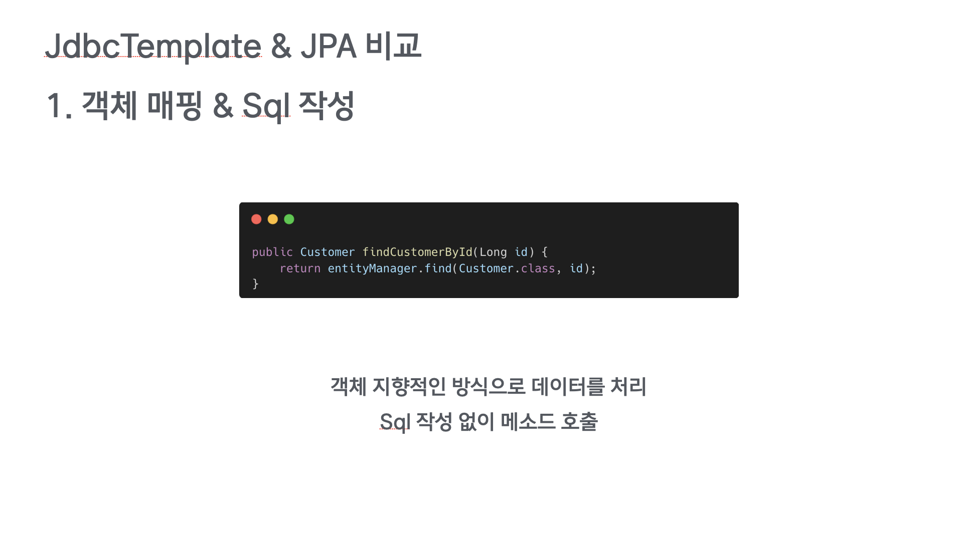 그래서, 예제 코드에서 보듯이, JPA를 사용하면 데이터베이스 접근 로직이 간단해지고, 개발자는 비즈니스 로직에 더 집중할 수 있습니다.