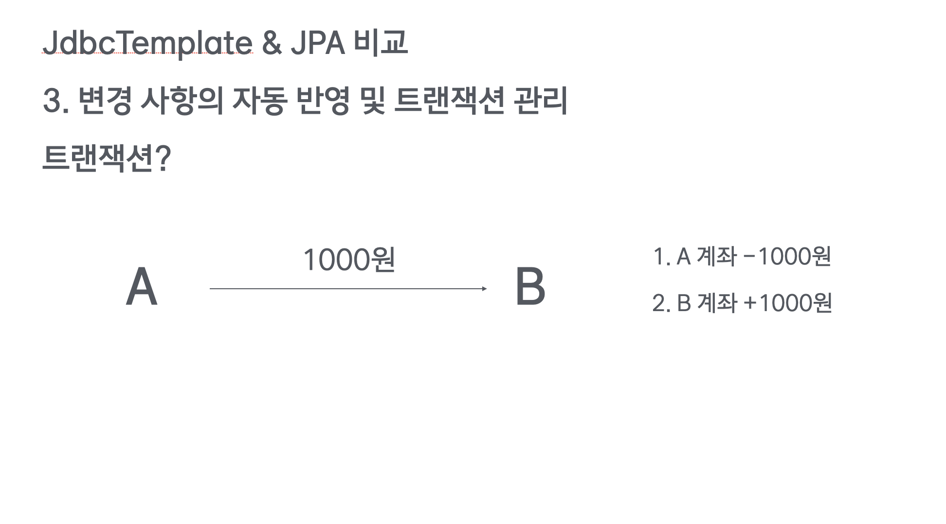 처음에 A계좌에서 마이너스 1000원을 하고, B계좌에서 플러스 1000원을 해야됩니다.