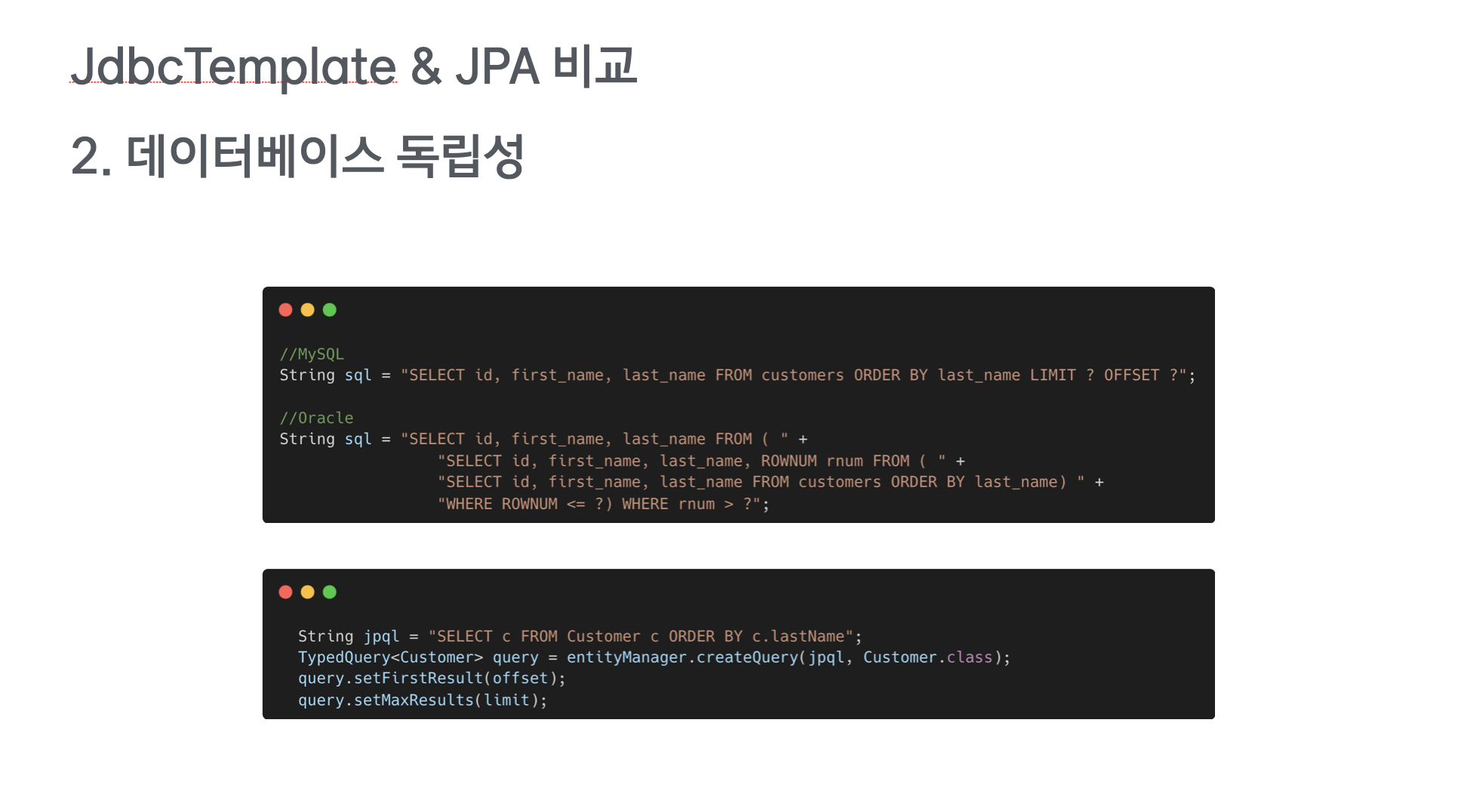 예제 코드에서는 같은 동작이지만 MySQL과 Oracle에서 다르게 SQL을 작성해야하는 모습을 볼수있습니다.