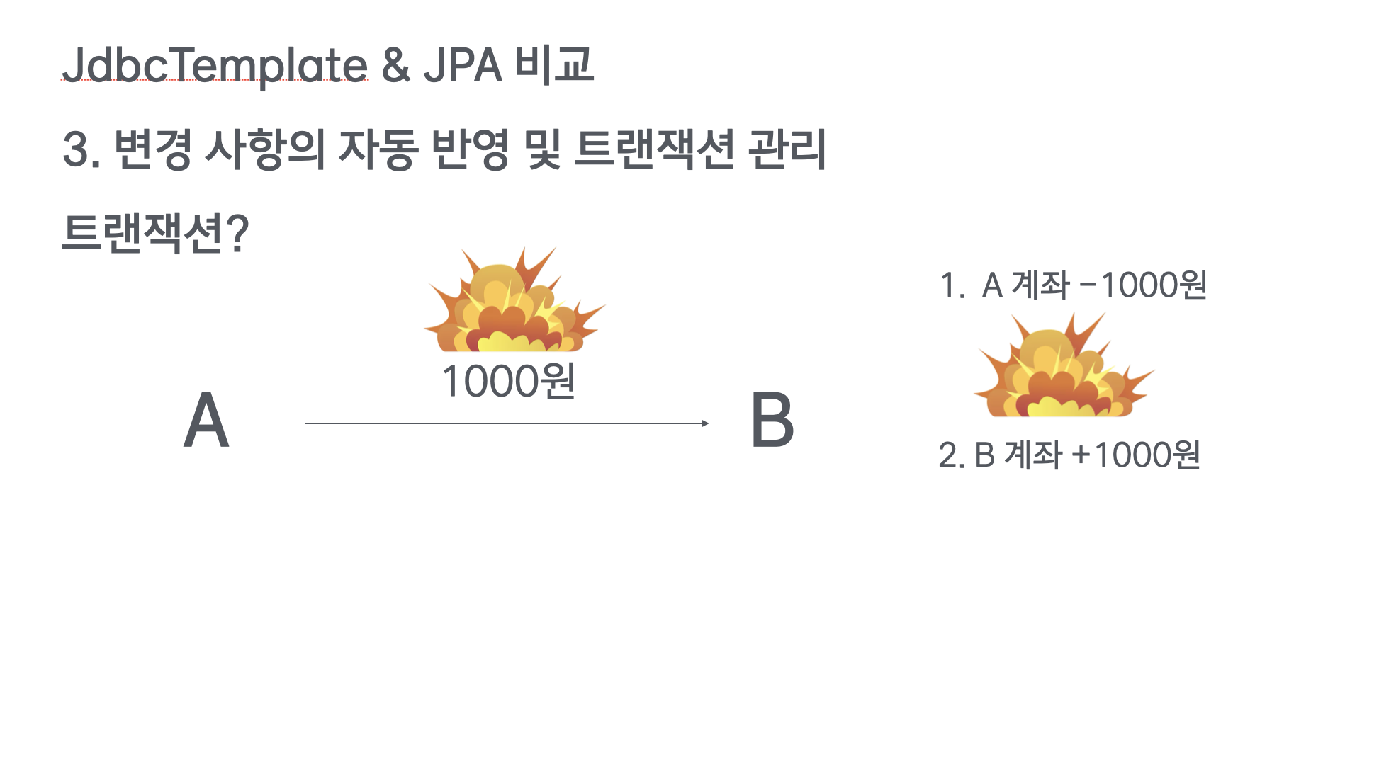 그런데, 만약 1번과 2번 과정 사이에 장애가 발생하면 어떻게 될까요? 1번 과정만 반영이 되고, 2번 과정은 반영이 안되서, A만 1000원 손해보는 상황이 발생할 겁니다