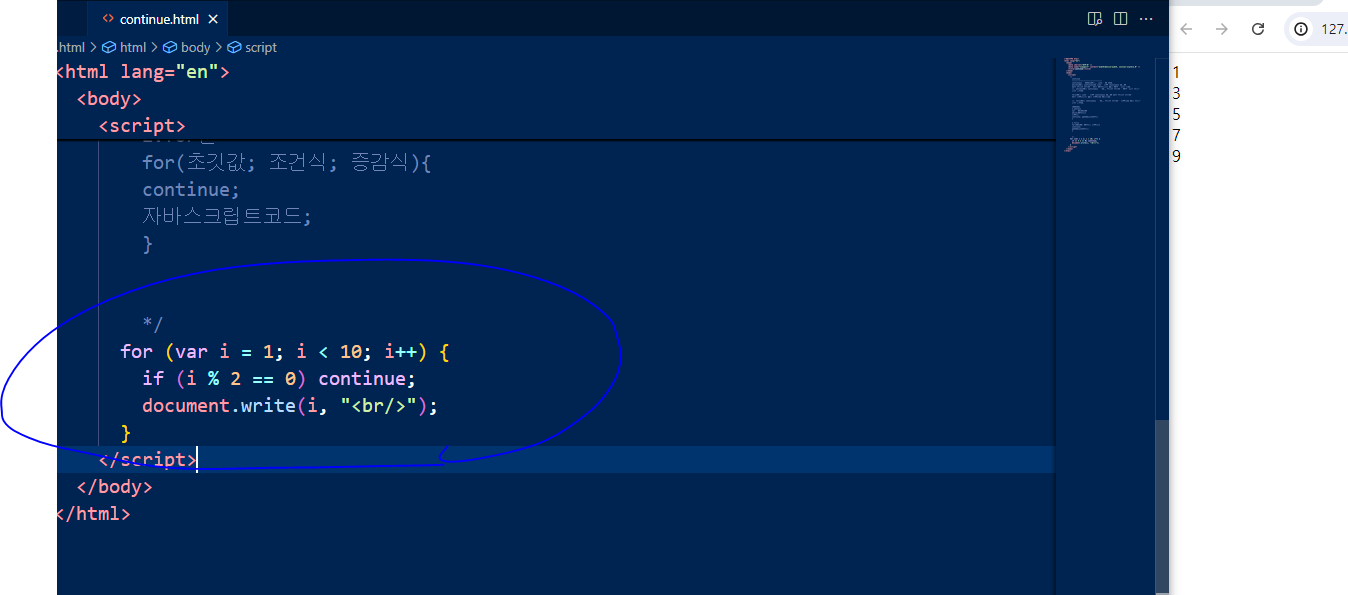 즉, for문에서 continue문은 '다음 코드는 무시하고 증감식을 실행 해라!'