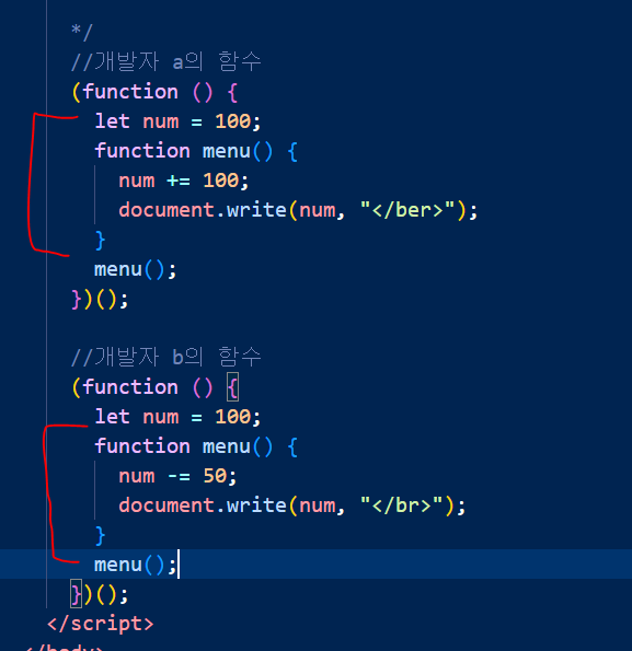 개발자 a함수에 있는 num과 menu는 개발자b가 선언한 num과 menu와 각각 다른 함수와 변수로 취급된다.