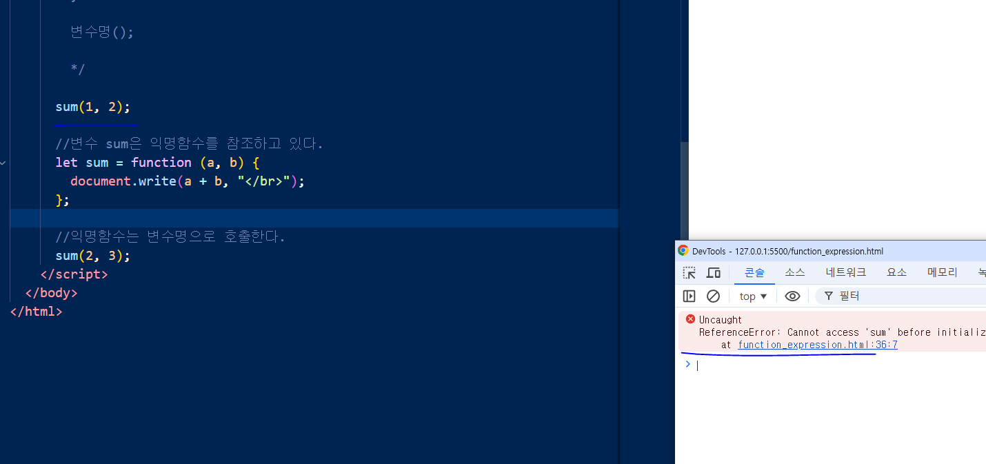 만약 let이 아니라 호이스팅이되는 var로 바꿔도 오류가 난다.