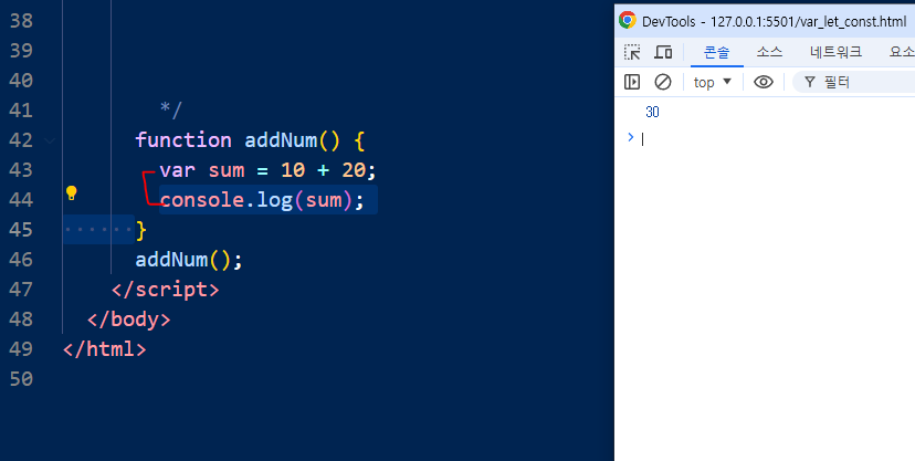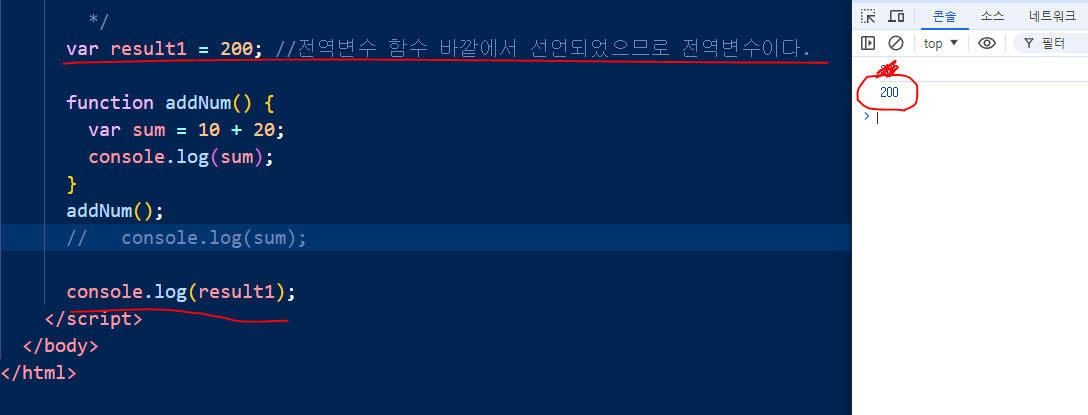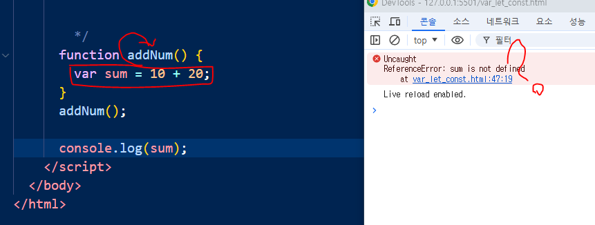콘솔창에는 선언된 적이 없다고 뜬다. = sum은 전역에서 선언된 적이 없으므로 오류가 나타난다.= 전역변수