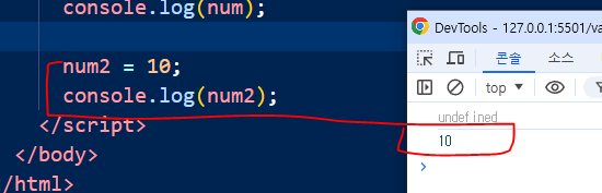 또한 변수(var)를 적지 않았는데도 10이 뜨는 결과.. 값이 없는건데 자바스크립트는 오류를